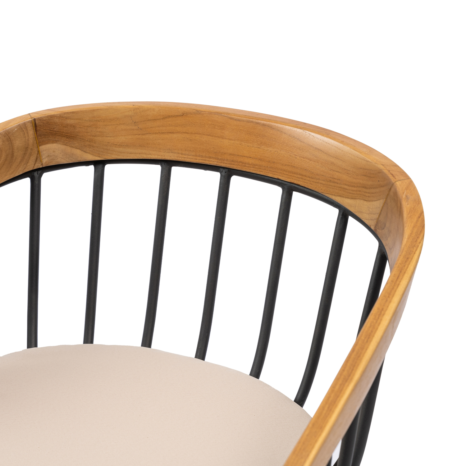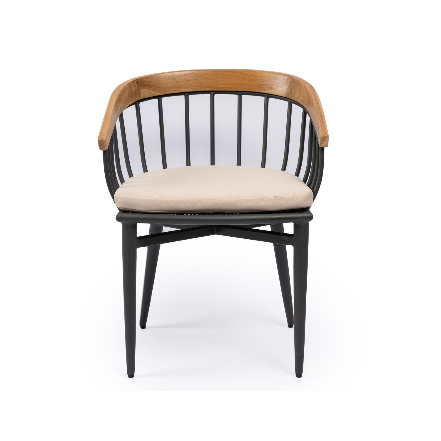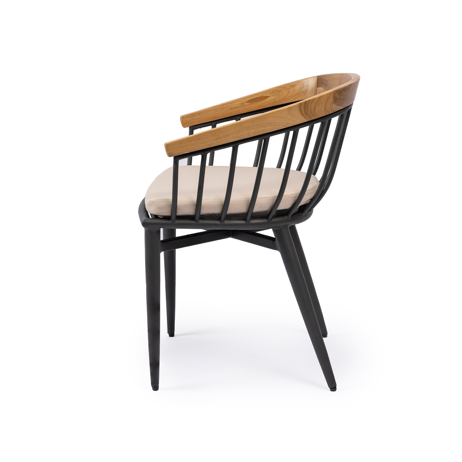 The Dining Chair Batavia blends natural beauty and robust design, featuring a durable antrasit aluminum frame complemented by a stunning curved backrest made of teak wood. This comfortable chair comes complete with a cushion, ensuring luxurious seating for extended meals. The Batavia chair is a stylish and enduring choice for any sophisticated dining space.