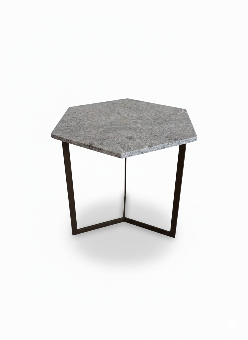 Side Table. Hexagonal blue marble and brass toned iron support.