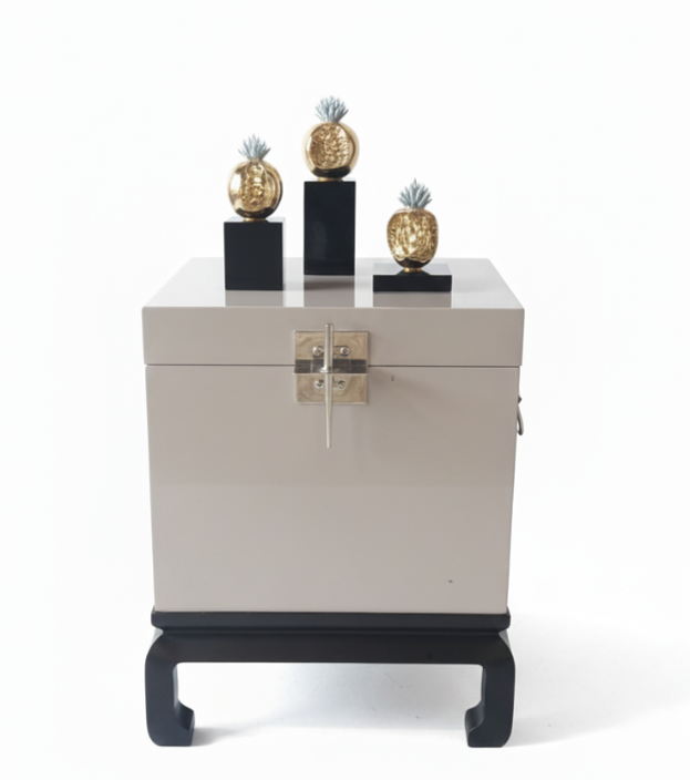 Elevate your space with this elegant Ming Box, featuring a sophisticated beige lacquer finish and classic brass hardware with an Asian-inspired clasp. This versatile piece functions beautifully as a stylish end table or a chic storage chest, sitting atop a sturdy black base with traditional curved feet. Perfect for adding a touch of timeless, refined glamour and practical storage to any contemporary or traditionally styled room.