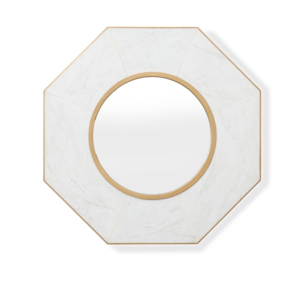 The Mirror Octo elevates any space with its sophisticated octagonal silhouette and crisp design. Crafted from durable Poplar wood with a stunning white finish, the frame features marbled panels surrounding a central, circular mirror opening. This exquisite piece seamlessly blends classic geometry with modern materiality, making it a luxurious focal point for your entryway, living room, or bedroom.