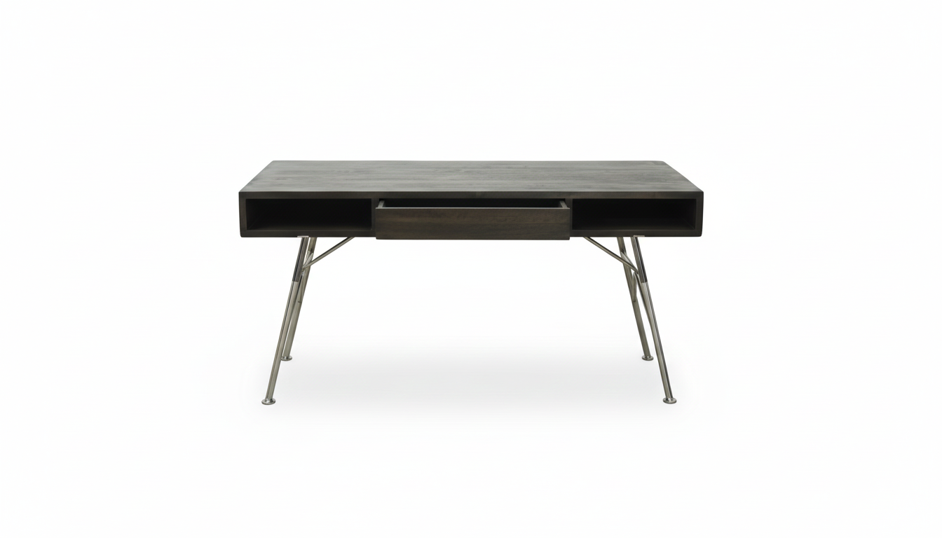 Introducing the Desk Soul, a sophisticated piece that seamlessly blends contemporary design with natural materials. Crafted with a rich Mahogany wood top in a deep brown finish, it rests upon sleek, eye-catching Aluminum legs for a modern silhouette. Its clean lines and central drawer offer both elegance and practical storage, making it the perfect centerpiece for any stylish workspace.